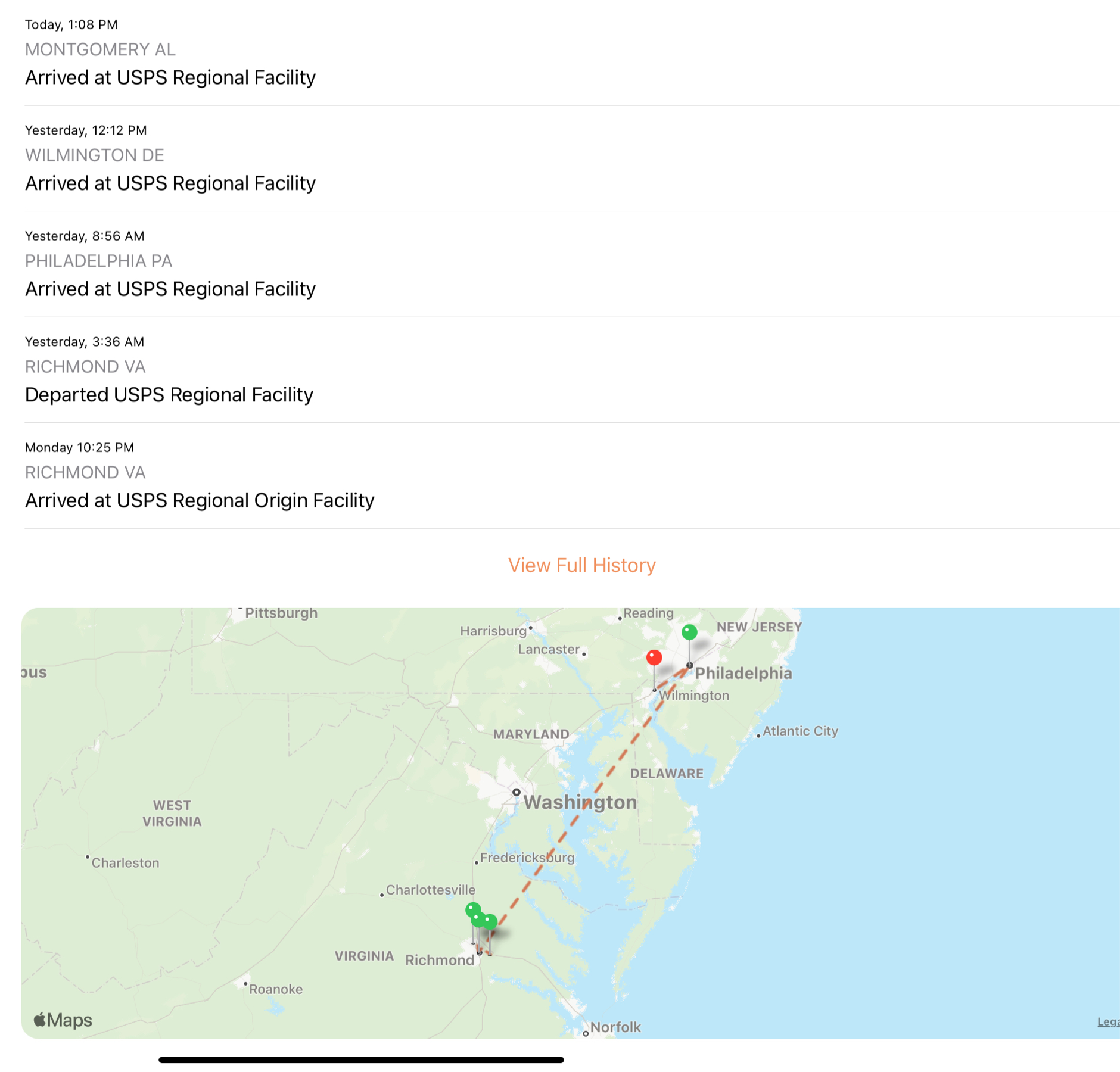 @USPS must be using a blind routing algorithm. To get to Dover, DE, you go to Wilmington, DE and then ship to Alabama? WTF?